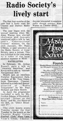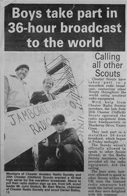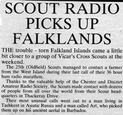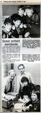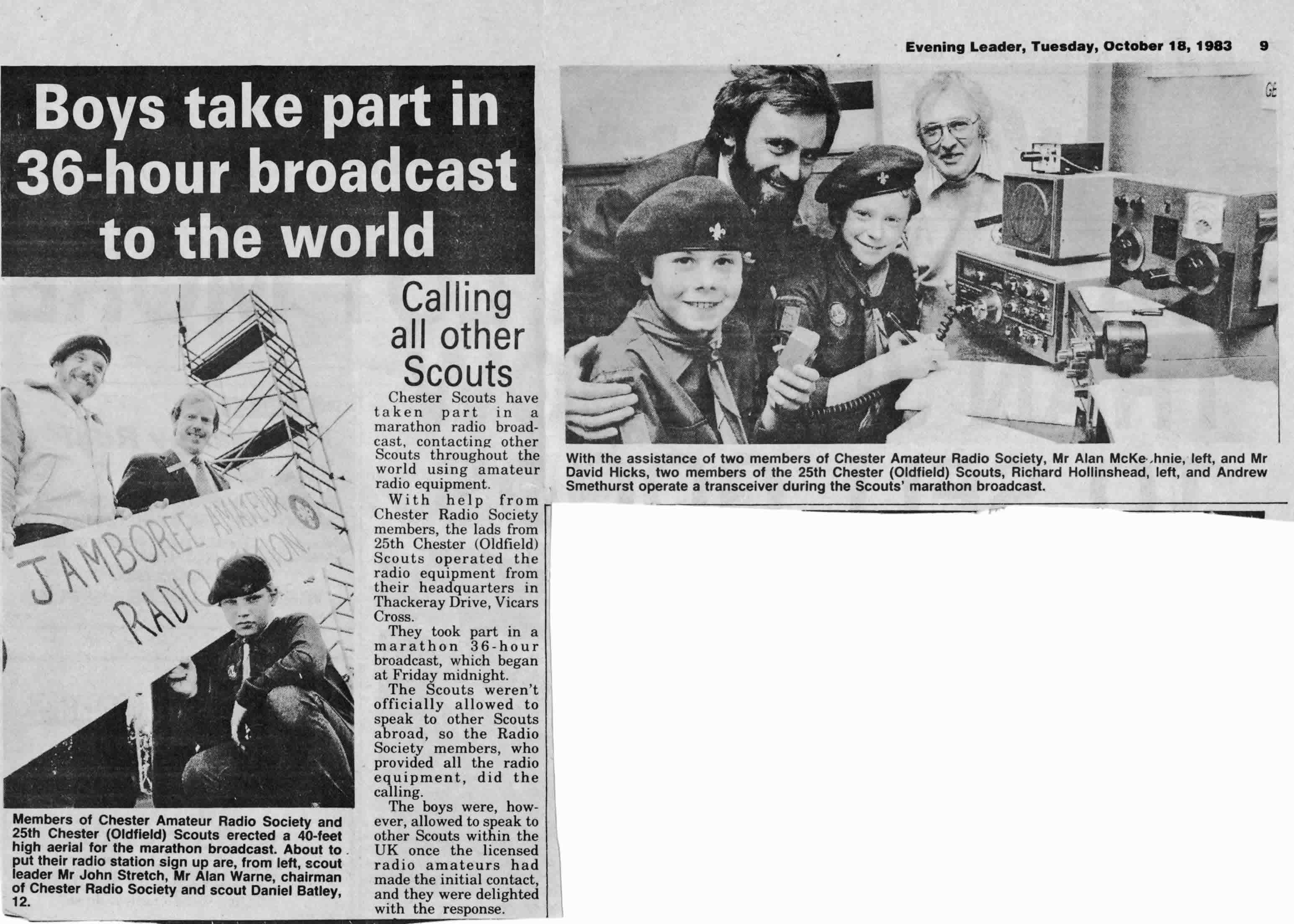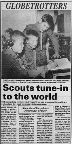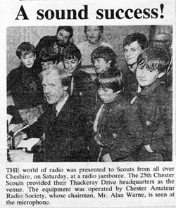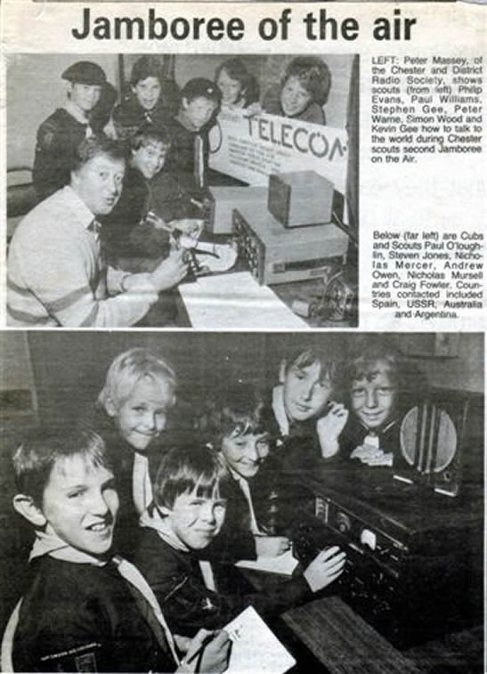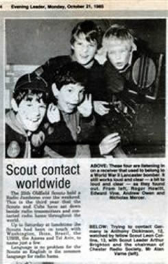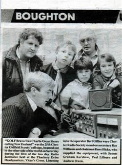 These Jamboree on the Air photos and press cuttings have been contributed by Tony G3TRL. Led by Arthur Brighton, the Chester Oldfield Scouts were active on JOTA from 1983 with regular participation in the early years by members of the C&DRS. Please note image sizes behind the thumbnails below vary considerably.