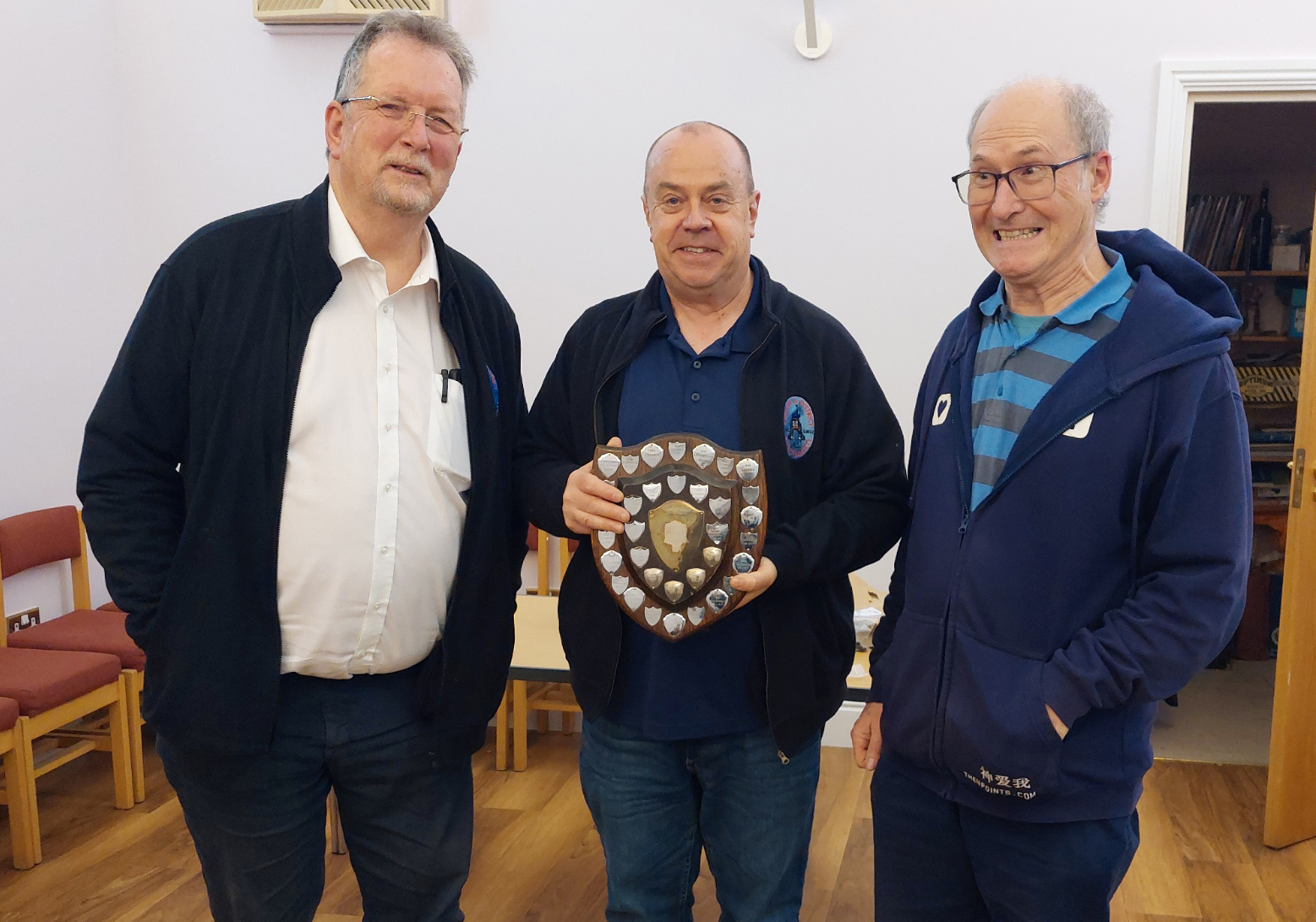 | The Society held its annual construction competition on January 15th with many interesting and well constructed entries. Judging was undertaken by Howarth, GW3TMP, who adjudged the Portable Delta Loop Antenna built by David, G3UFO, as winner. David is pictured (R) receiving the G3FNV Shield from our Chairman G3TZO. All entrants will have the chance to describe their projects at our meeting on 5th March. |