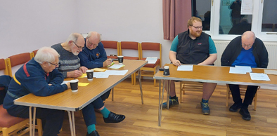 | Wednesday 27th April saw the annual rematch between Chester & the Wirral & District Amateur Radio Club competing for the G3PYU Trophy. Thirty very testing general knowledge questions were followed by 30 impossible radio questions needing a tie break to separate the well matched teams. Just the one point was enough for Chester to regain the trophy. Pictured are the Chester team of (l to r) Dave G4JMF, Paul G3TZO & Bruce M0CVP. Also pictured 2nd from left is Daniel M6CUL who posed the GK questions. |