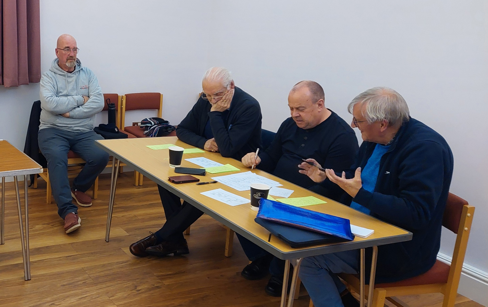 | On Wednesday 27th November we rejoined battle with our friends from Wirral & District Amateur Radio Club (WADARC). As usual the questions were fiendishly difficult but on this occasion just less so for WADARC. A superb buffet finished a very pleasant evening Pictured left to right are Phil G6IIM, Ian M1ICL, Gordon G8MMM and Brian G0VAX. |